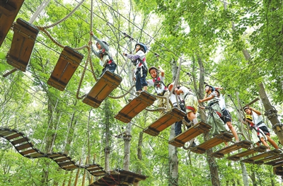 正值暑期,孩子们在亲近自然中锻炼身心,收获成长与快乐。图为7月26日,孩子们在江苏连云港市枫树湾丛林乐园体验空中探险。新华社发