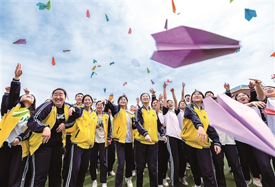 5月23日,内蒙古自治区呼和浩特市第十二中学高三学生将写有自己梦想的纸飞机抛向空中。2023年高考日益临近,该校在做好高三学生复习备考的同时,开展多种形式的趣味健身活动,帮助高三学生增强身体素质、保持阳光心态。丁根厚 摄
