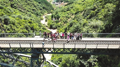 北京大学新闻与传播学院“行走的人”调研团队在滇越铁路标志性路段白寨大桥上。 张祺祺 邱佳阳 摄