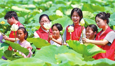 7月7日,江苏省海安市墩头镇千步村,南京工业大学建筑学院暑期支教大学生志愿者在浅水藕田边教小学生认识荷花、莲蓬,讲解莲藕生长知识。周强 摄