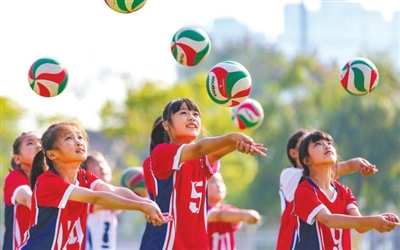 江苏省海安高新区丹凤小学学生在练习排球。